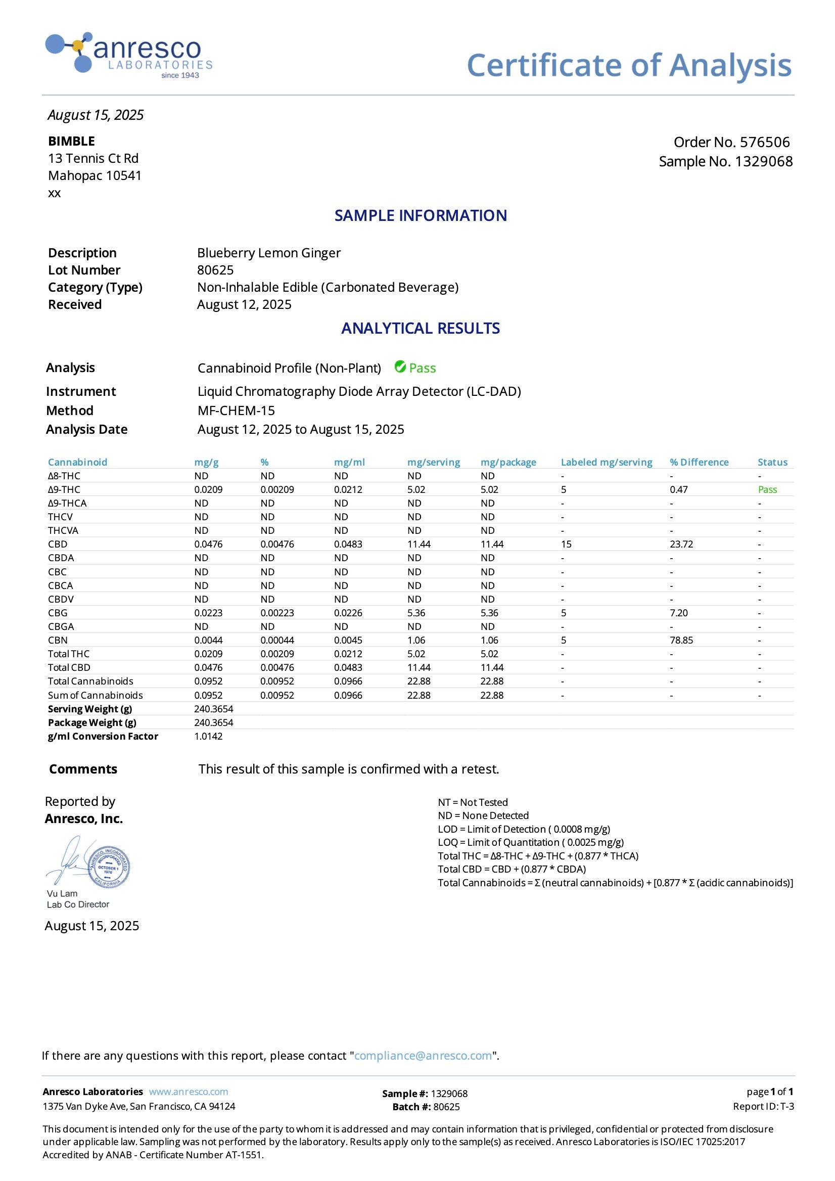 Bimble Ingredients and Certificate of Analysis | Hemp COA